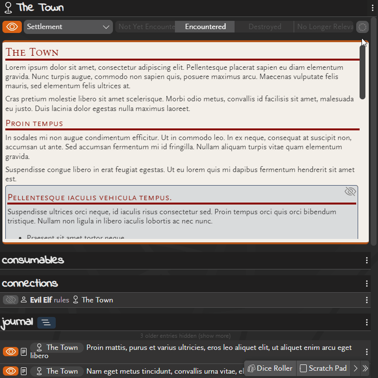 A couple of layout options have been added today Unrestricted notes panel size A new button alongside the edit notes and full-screen buttons toggles the maximum height of the notes so everything scrolls together rather than having scrollable panels inside scrollable panels Pinned journal Keep the journal entries on screen all the time from a ..