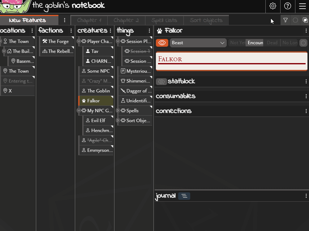 In notes, statblocks, consumable description, and journal entries you can mention objects without having to click the objects in the lists. Just type @ and start typing the object name to see a popup of objects starting with the text you typed. Up to 5 results will be retuned, continue typing to filter more. Use ..