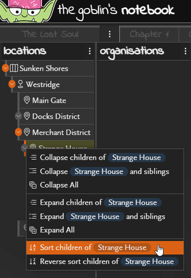 Child objects can be sorted alphabetically (or reverse alphabetically) from the context menu on the expand/collapse button on the parent object.